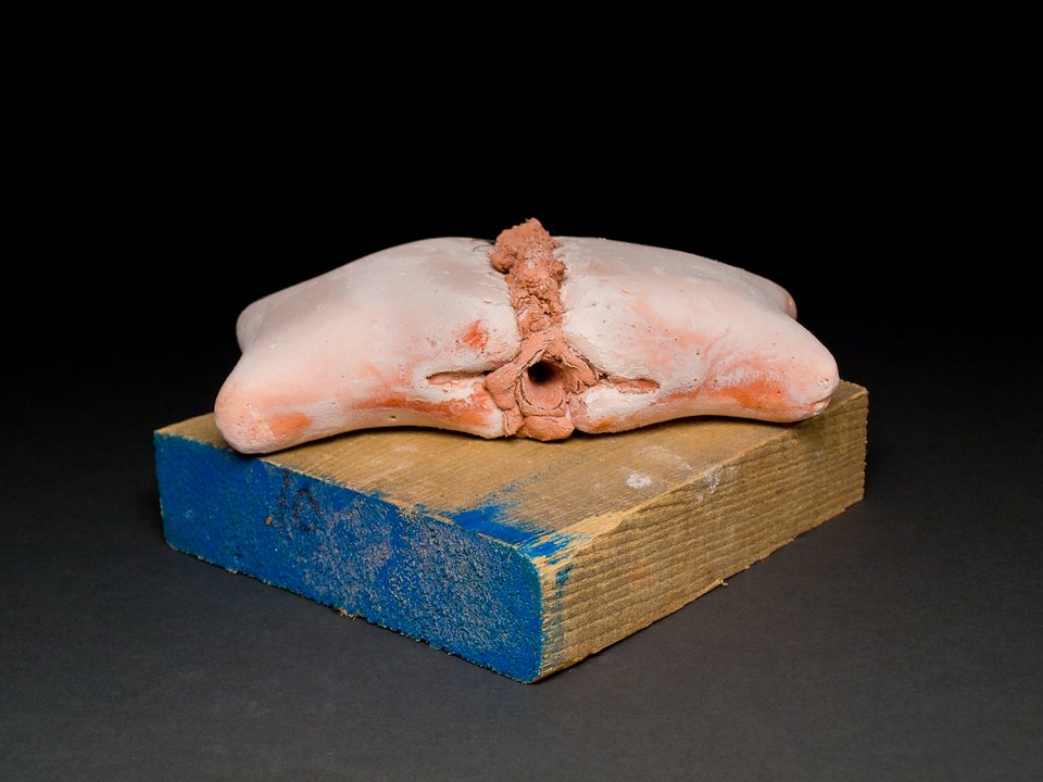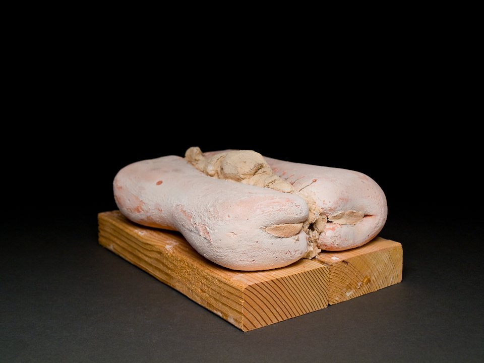 Plaster, self-glazing butter clay, wire, found wood, 2014.