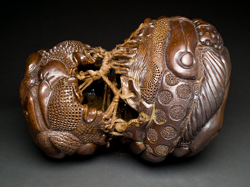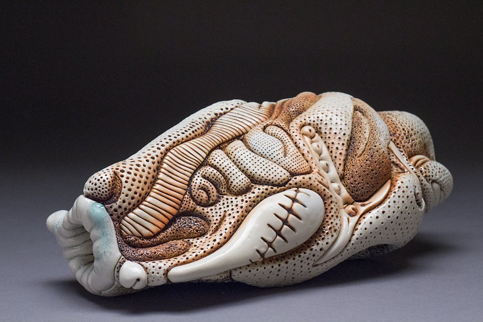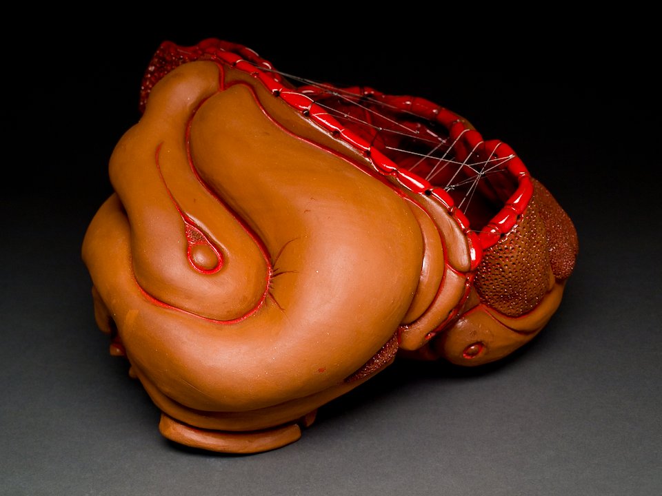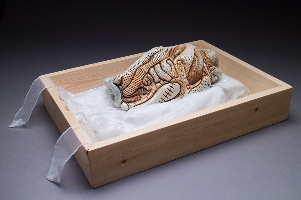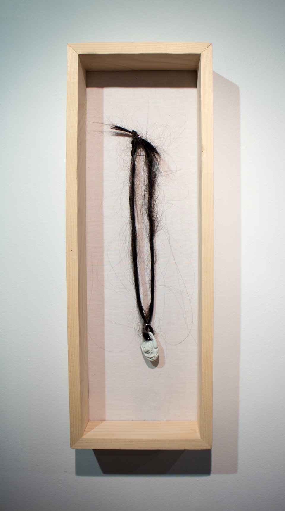 25 x 9 x 3.5", porcelain, hair, pins and wood, 2012-13.